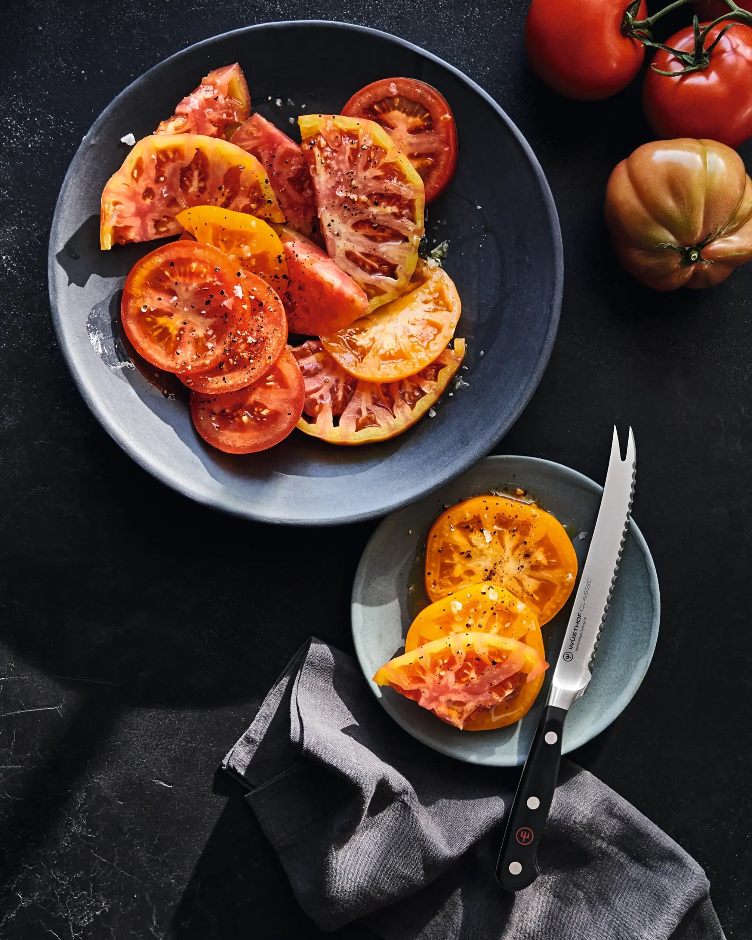 Wüsthof Classic 番茄刀 14 公分 – 5 吋 是掌握您廚房中最具欺騙性且細膩食材之一的理想刀刃。得益於其細鋸齒刀刃,這把Wüsthof刀能輕鬆滑過即使是最熟的番茄,而不會壓碎其柔軟果肉。無論您是在製作完美三明治,還是為夏日沙拉添加細薄番茄片,tomato knife classic wusthof都能確保每一刀切割乾淨、可控且一致。