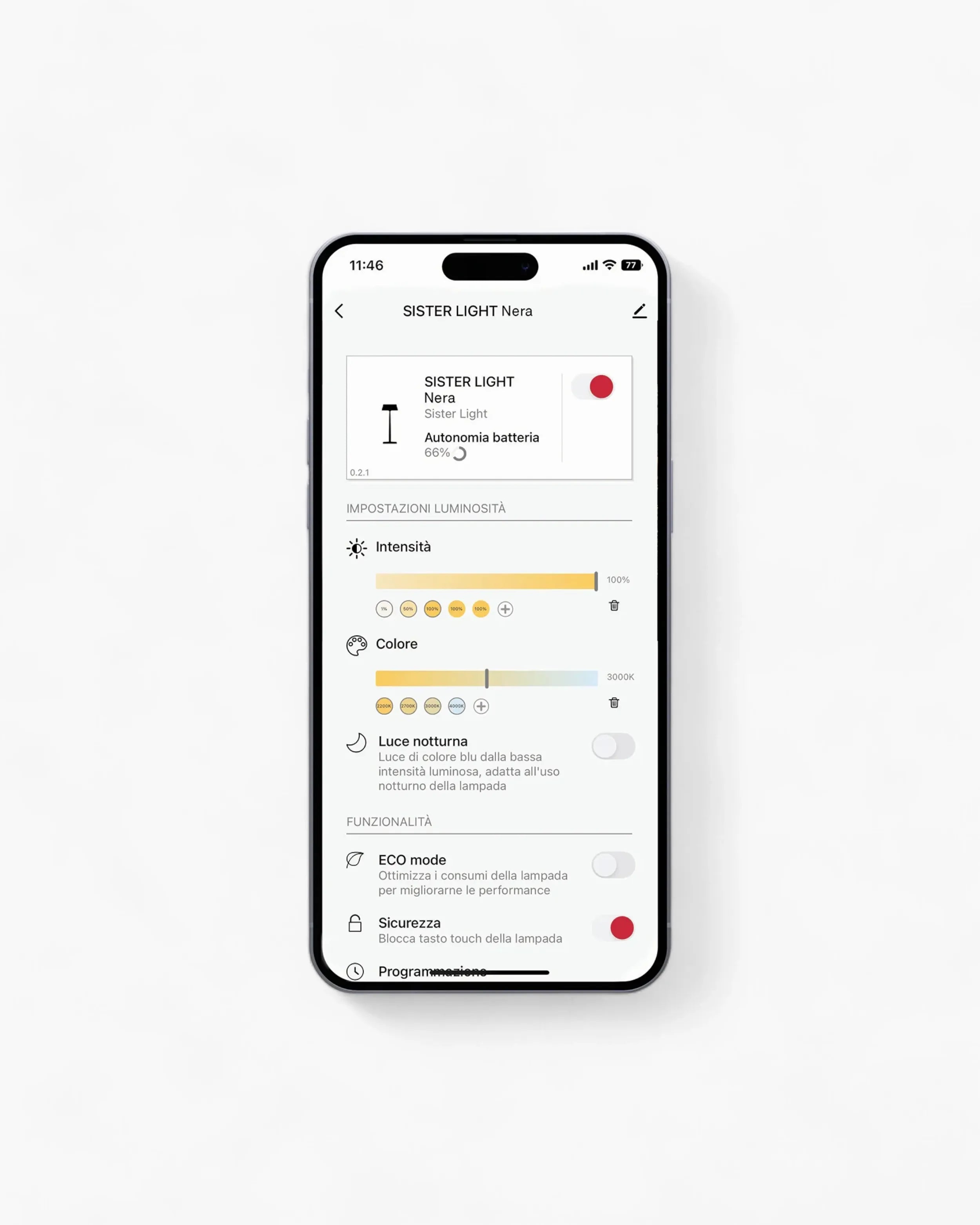 這款先進的燈具提供四段可調光的LED光源,讓您只需輕觸即可創造完美的氛圍。創新的自訂選單讓您輕鬆調整光線溫度和控制亮度,給予您完全的靈活性。這款燈具真正獨特之處在於其燈頭,可以分離並用作應急光源,得益於其可轉換的磁性固定裝置。底座也設計為機械固定,以確保在任何桌面上穩定,不論是室內還是戶外。Sister Light Wi-Fi Zafferano 提供無與倫比的可用性。